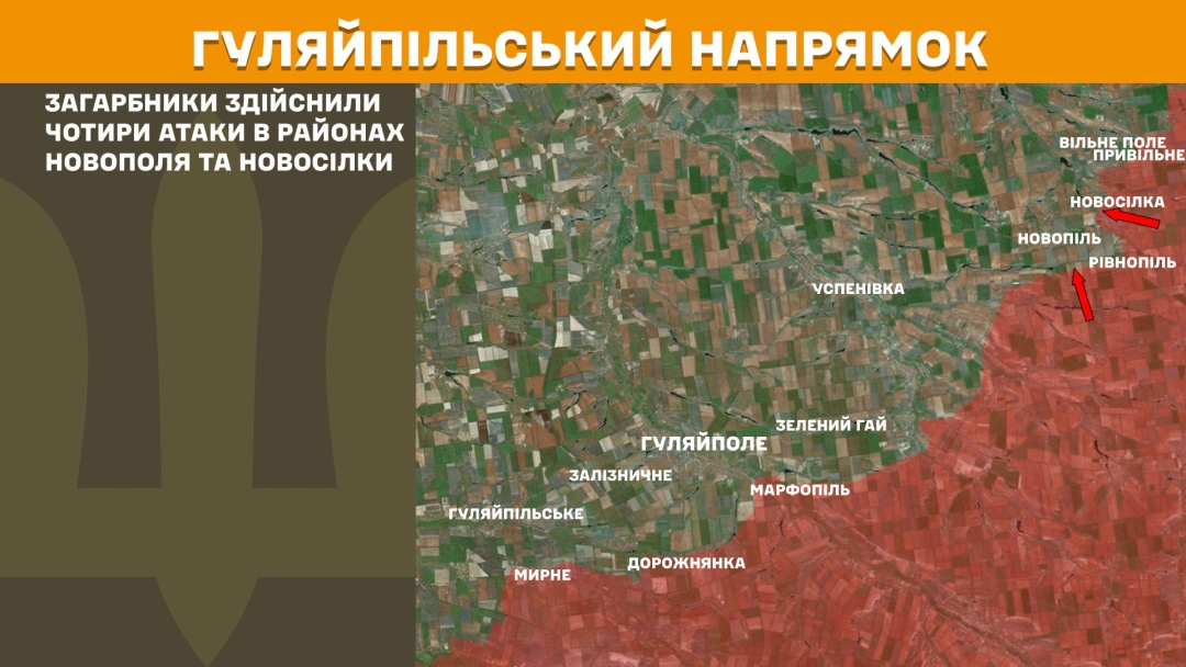 На Гуляйпільському напрямку загарбники здійснили чотири атаки в районах Новополя та Новосілки.