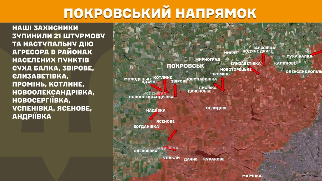 На Покровському напрямку українські захисники зупинили 21 штурмову і наступальну дію ворога в районах населених пунктів Суха Балка, Звірове, Єлизаветівка, Промінь, Котлине, Новоолександрівка, Новосергіївка, Успенівка, Ясенове, Андріївка.