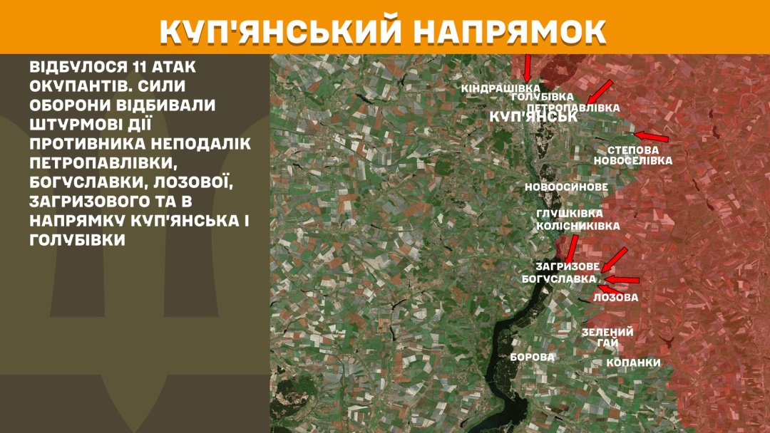 На Куп’янському напрямку зафіксовані 11 атак загарбників. Сили оборони відбивали штурмові дії неподалік Петропавлівки, Богуславки, Лозової, Загризового і в напрямку Куп’янська та Голубівки.