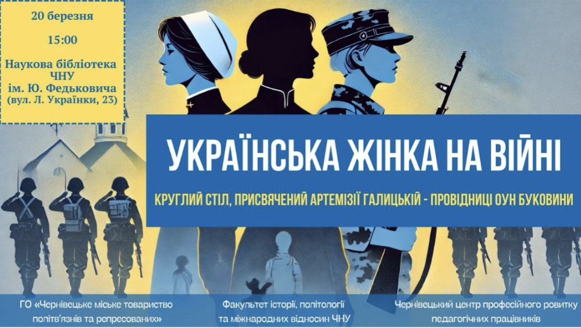 20 березня в Науковій бібліотеці ЧНУ ім. Ю. Федьковича відбудеться історичний круглий стіл «Українська жінка на війні», організований Факультетом історії, політології та міжнародних відносин у співпраці з ГО «Чернівецьке міське товариство політвʼязнів та репресованих» та Чернівецьким центром професійного розвитку педагогічних працівників.