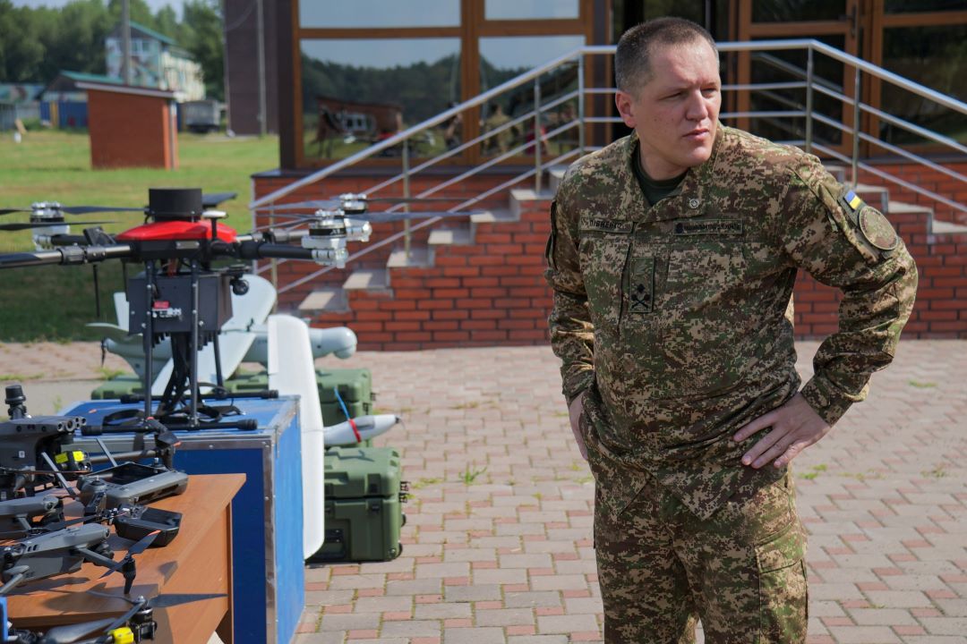 Командувач НГУ Олександр Півненко оглядає вироби власної майстерні НГУ у липні 2024 року. В той час вже тривали розробки українських дронів на оптоволокні. Фото Укрінформ
