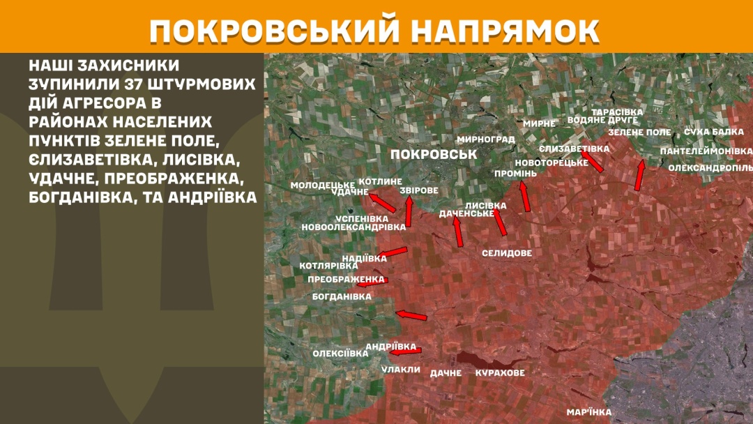 На Покровському напрямку захисники України зупинили 37 російських штурмових дій в районах Зеленого Поля, Єлизаветівки, Лисівки, Удачного, Преображенки, Богданівки та Андріївки.