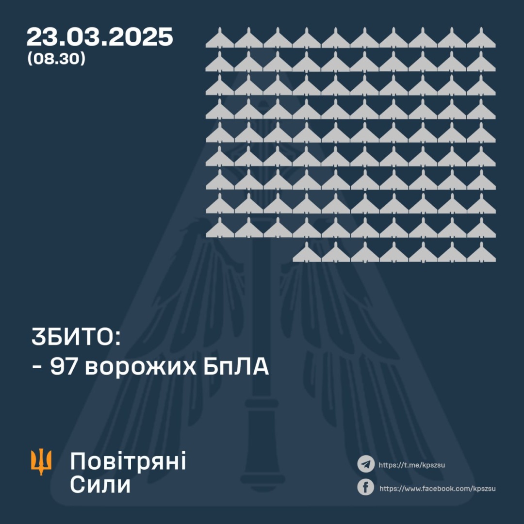 Станом на 08.30 неділі, 23 березня, підтверджене збиття 97 ударних БПЛА типу Shahed (безпілотників інших типів) на півдні, півночі, заході та в центрі України.