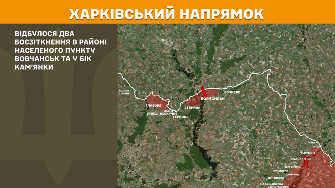 Минулої доби на Харківському напрямку сталися два боєзіткнення в районі Вовчанська та у бік Кам’янки.