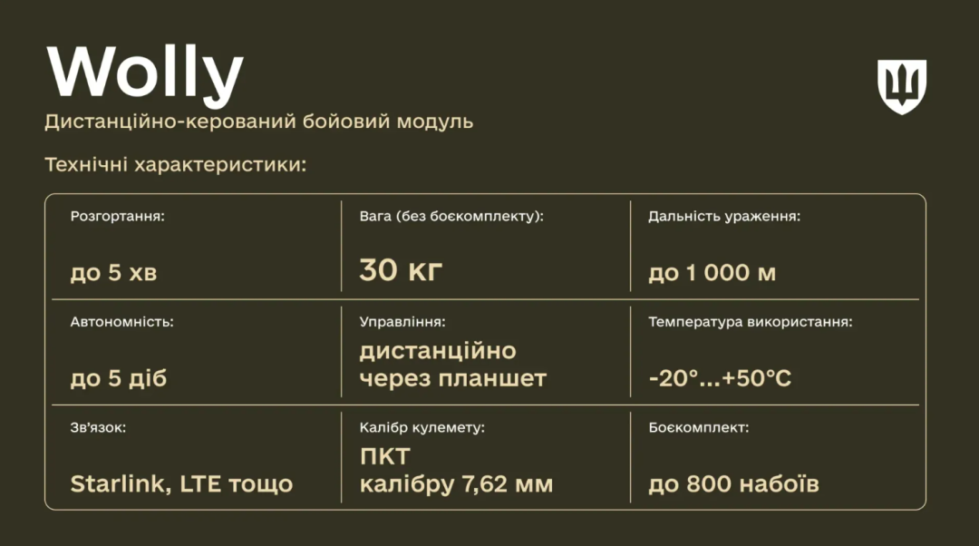 Як повідомляв Укрінформ, у грудні 2024 року Міноборони кодифікувало та допустило до використання у підрозділах Сил оборони дистанційно керований бойовий модуль Wolly українського виробництва.