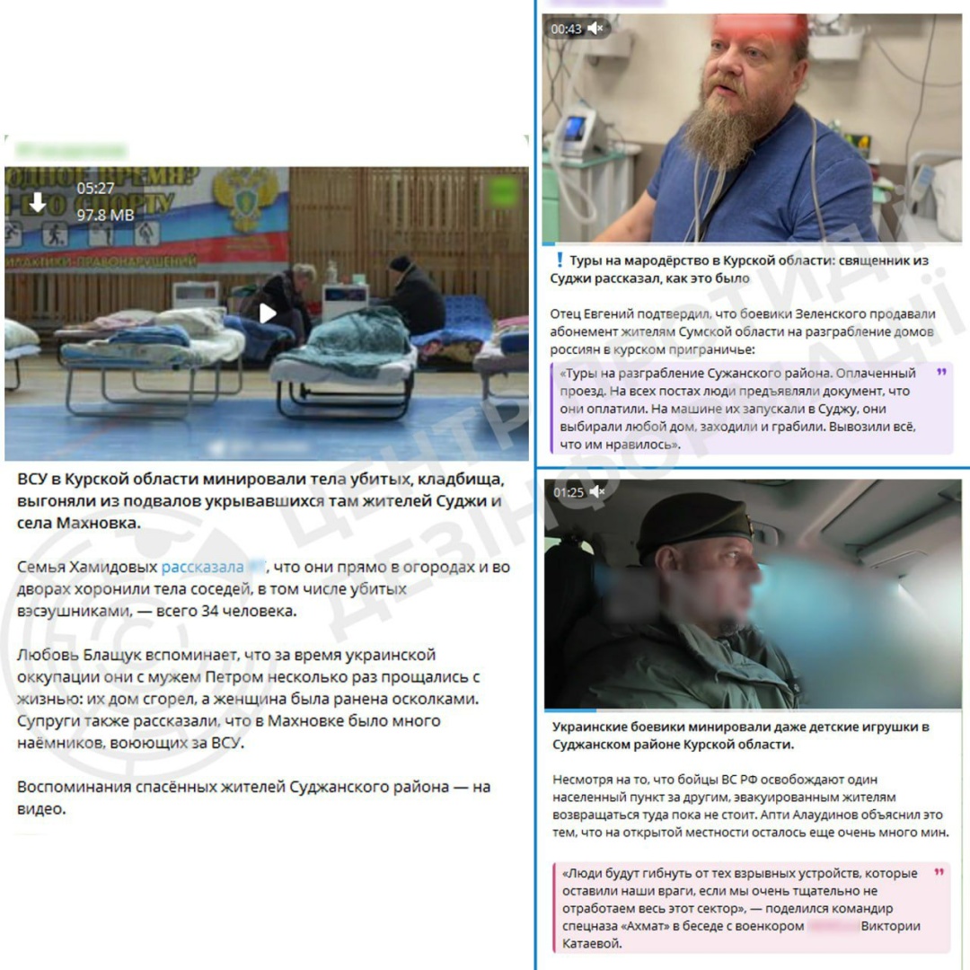 Як зазначається, найбільшою групою фейків залишаються відео зі «свідченнями» жителів Курщини. Часто вони не стримують фантазії та доходять до абсурду. До прикладу, шириться відео з місцевим священником, який говорить, нібито українські військові за гроші організовували «тури на мародерство» у Курську область для жителів Сумщини. В іншому випадку розповідають про чоловіків, які займалися похованням тіл «убитих ЗСУ цивільних». Але на відео чоловіки говорять, що у більшості випадків це були літні люди, які померли від природних причин.