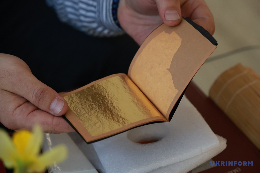 Також Андрій показує нам маленьку книжечку з пластинками сусального золота. У ній – 25 пластинок, ціна «книжечки» – трохи менше ніж дві тисячі гривень. Золотом прикрашають ікону на фінальній стадії. За словами митця, на ікону розміром 30 на 40 см потрібно близько 15 таких пластинок.