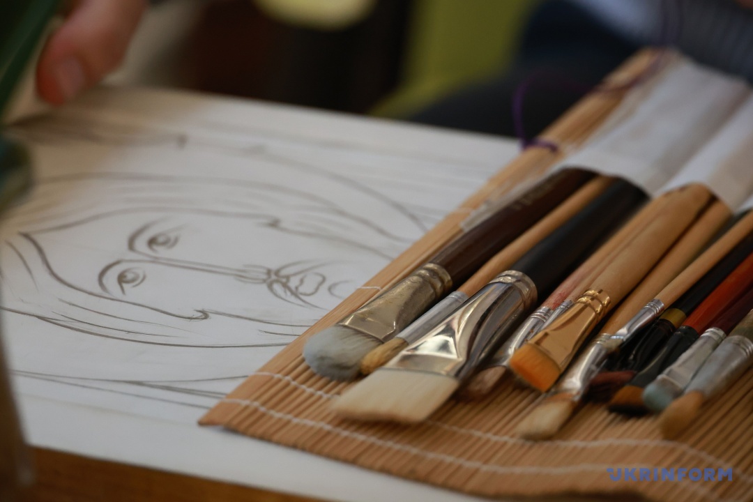 Також майстер дивує нас набором своїх пензлів. Каже, найчастіше для іконопису використовує інструменти з хутра білочки. Також пише пензлями з ворсу колонка, поні, кози, свині та навіть кішки.