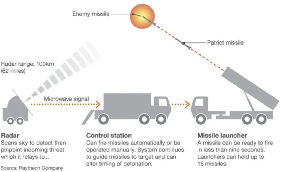 Як працює Patriot: схема отримання і передачі сигналу радаром до пускової установки. Ілюстрація www.bbc.com