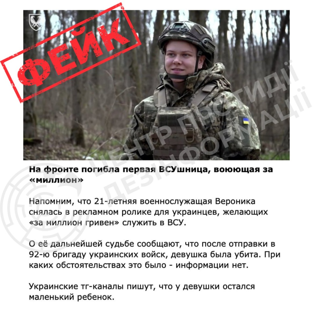 «Ворожі Tg-канали поширюють фейк про нібито загибель 21-річної учасниці програми «Контракт 18–24» Вероніки, яка раніше знялася в сюжеті про контрактну службу в ЗСУ. Це чергова брехня російських пропагандистів. У дописі до оригінального ролика зазначається, що Вероніка проходила службу в 72 бригаді, тоді як пропагандисти пишуть про 92-гу бригаду. Крім того, військовослужбовці за програмою «Контракт 18-24» продовжують проходити відповідну підготовку і не беруть участі у бойових діях», – йдеться в повідомленні.