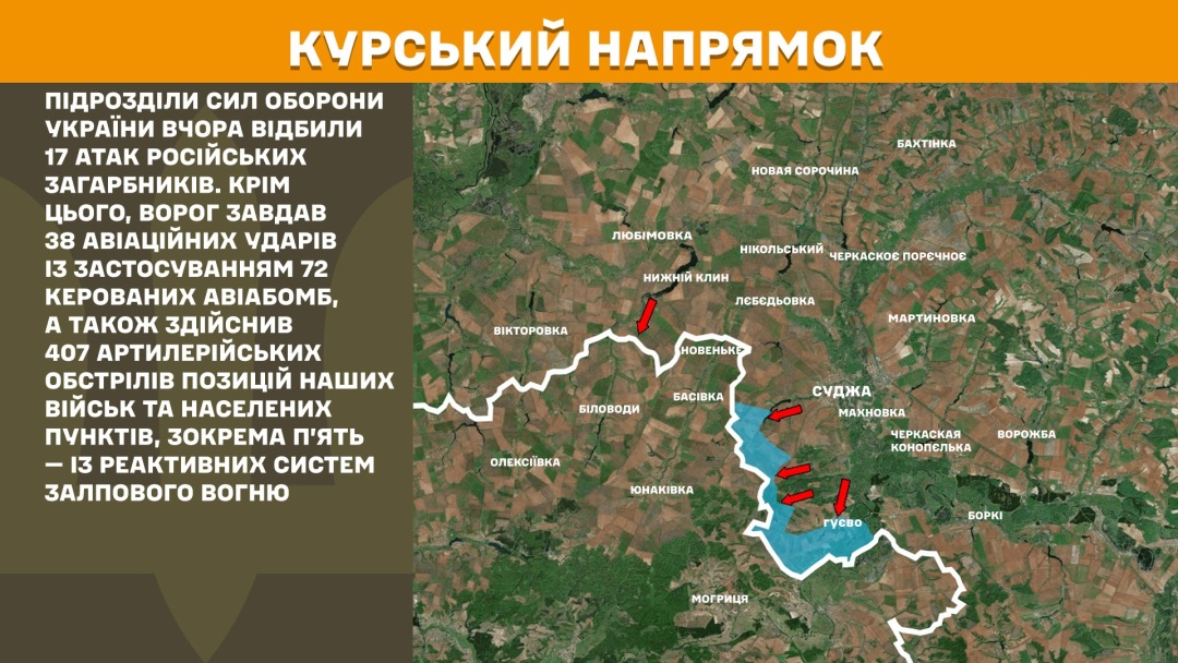 В операційній зоні у Курській області підрозділи Сил оборони України вчора відбили 17 атак російських загарбників. Крім цього, ворог завдав 38 авіаційних ударів із застосуванням 72 керованих авіабомб, а також здійснив 407 артилерійських обстрілів позицій наших військ та населених пунктів, зокрема п’ять — із реактивних систем залпового вогню.