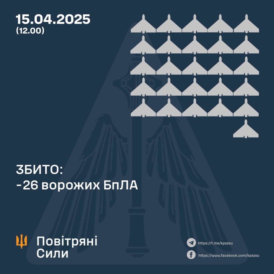 Сили оборони в ніч на 15 квітня збили 26 ворожих безпілотників, ще 19 дронів-імітаторів були локаційно втрачені без негативних наслідків.