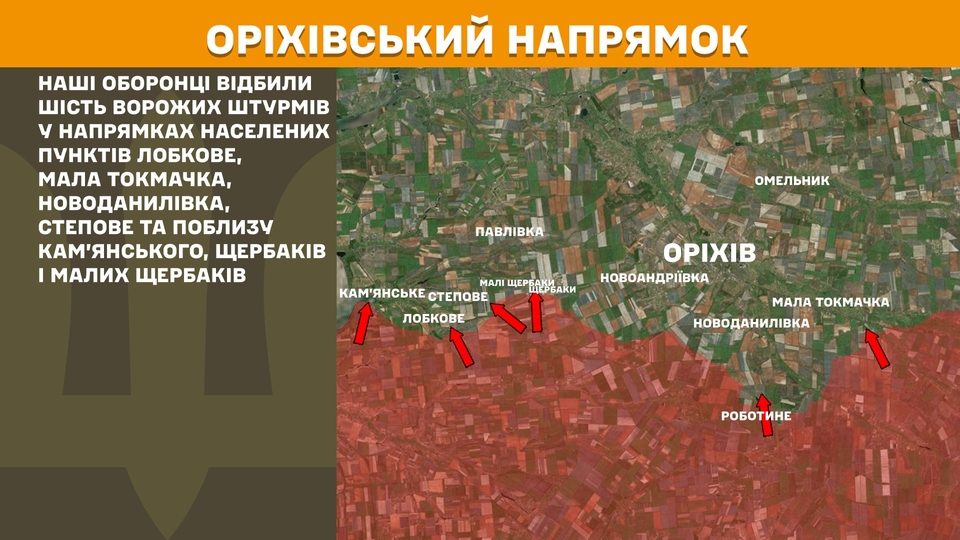 На Оріхівському напрямку Сили оборони відбили шість російських штурмів у напрямках населених пунктів Лобкове, Мала Токмачка, Новоданилівка, Степове та поблизу Кам’янського, Щербаків і Малих Щербаків.