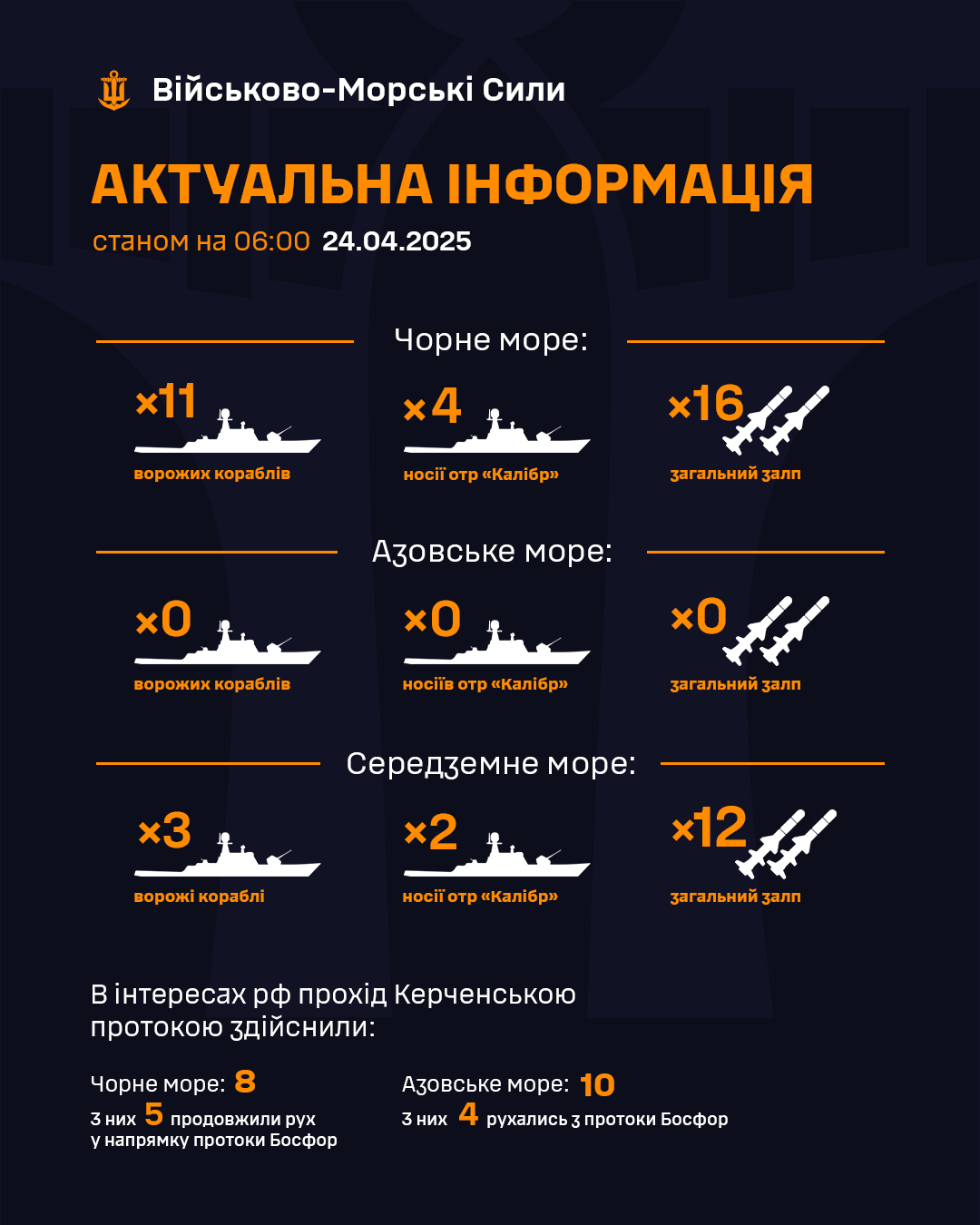 Росія станом на 06:00 четверга, 24 квітня, тримає у Чорному морі 4 військові кораблі, які є носіями «Калібрів», загальним залпом до шести ракет.