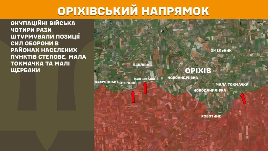 На Оріхівському напрямку війська РФ чотири рази штурмували українські позиції в районах Степового, Малої Токмачки й Малих Щербаків.