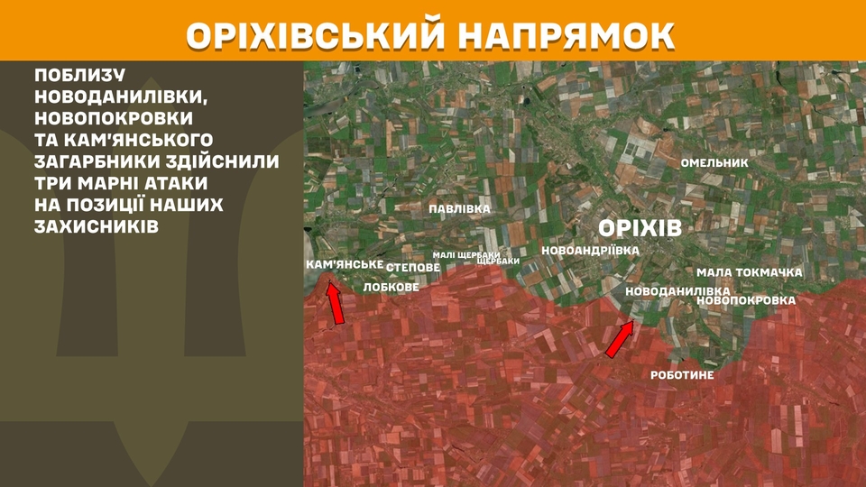 На Оріхівському напрямку поблизу Новоданилівки, Новопокровки та Кам’янського загарбники здійснили три безуспішні атаки на позиції Сил оборони.