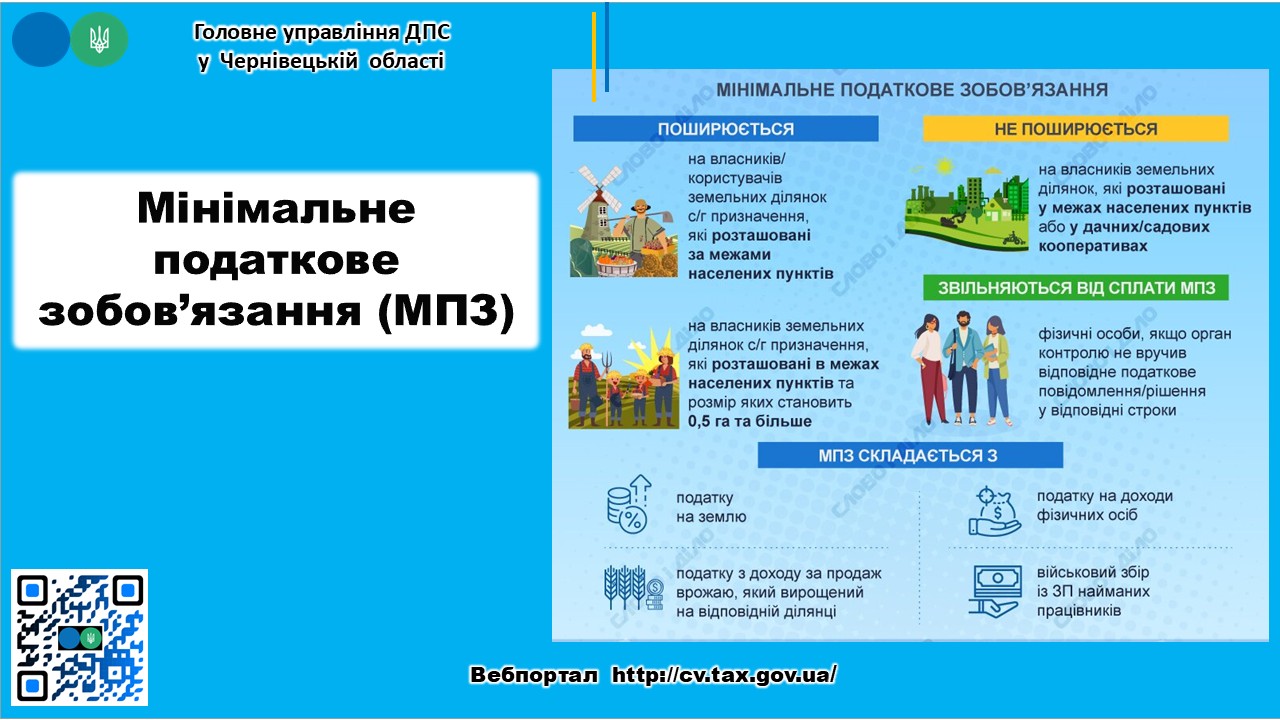 Фахівці Головного управління ДПС у Чернівецькій області інформують, що відповідно п.п.14.1.1142 Податкового кодексу України, мінімальне податкове зобов’язання (МПЗ) — це розрахункова сума податків, яка підлягає сплаті особами, що володіють або користуються сільськогосподарськими угіддями.