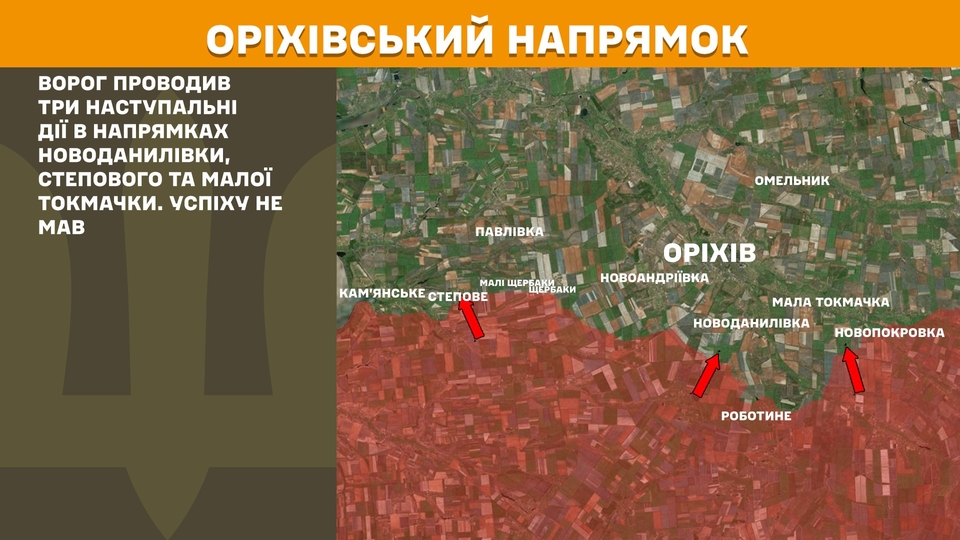На Оріхівському напрямку ворог проводив три наступальні дії в напрямках Новоданилівки, Степового та Малої Токмачки. Успіху не мав.