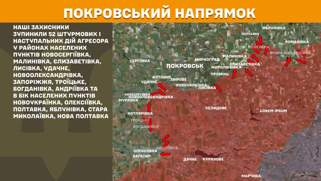 На Покровському напрямку захисники України зупинили 52 штурмові і наступальні дії росіян у районах населених пунктів Новосергіївка, Малинівка, Єлизаветівка, Лисівка, Удачне, Новоолександрівка, Запоріжжя, Троїцьке, Богданівка, Андріївка та в бік населених пунктів Новоукраїнка, Олексіївка, Полтавка, Яблунівка, Стара Миколаївка, Нова Полтавка.