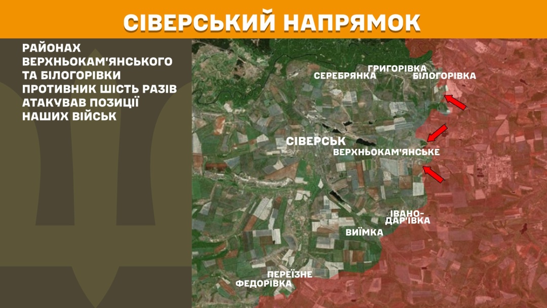 На Сіверському напрямку в районах Верхньокам’янського та Білогорівки противник шість разів атакував позиції наших військ.