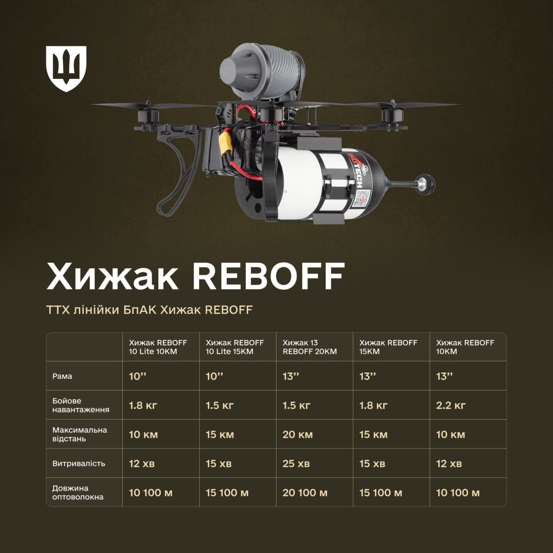 "Хижак REBOFF 10 Lite" з котушкою на 10 км розрахований на відбиття штурмів та для міських боїв. Його ефективна відстань – 8-9 км, адже зазвичай пілоти закладають 10-20% волокна на маневрування і погодні обставини.