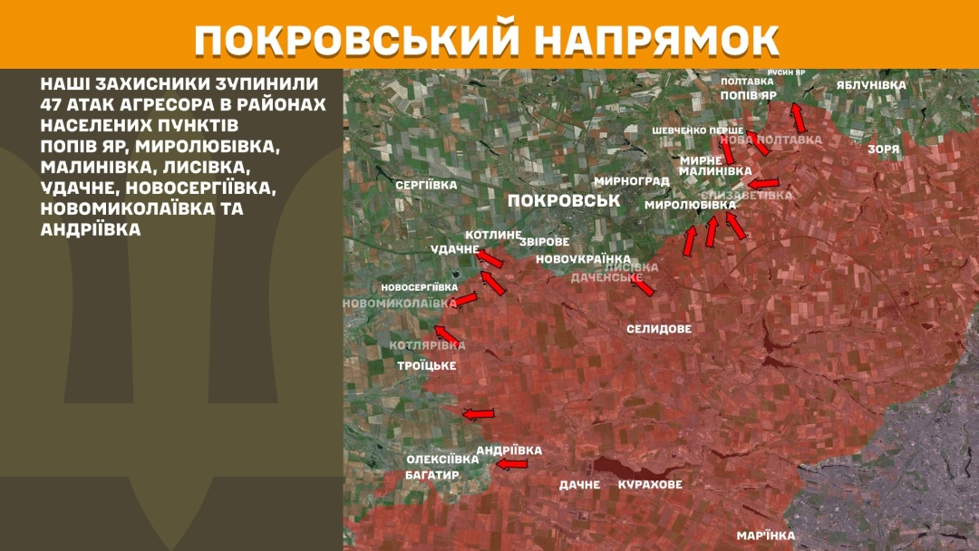 На Покровському напрямку наші захисники зупинили 47 атак агресора в районах населених пунктів Попів Яр, Миролюбівка, Малинівка, Лисівка, Удачне, Новосергіївка, Новомиколаївка та Андріївка.