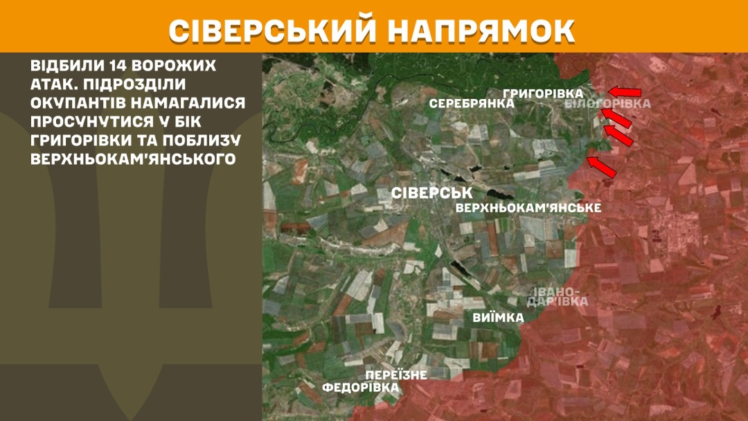 На Сіверському напрямку українські воїни відбили 14 ворожих атак у бік Григорівки та поблизу Верхньокам’янського.