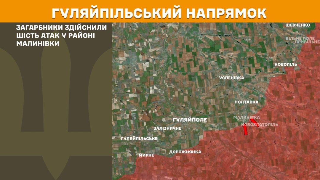 На Гуляйпільському напрямку загарбники здійснили шість атак у районі Малинівки.