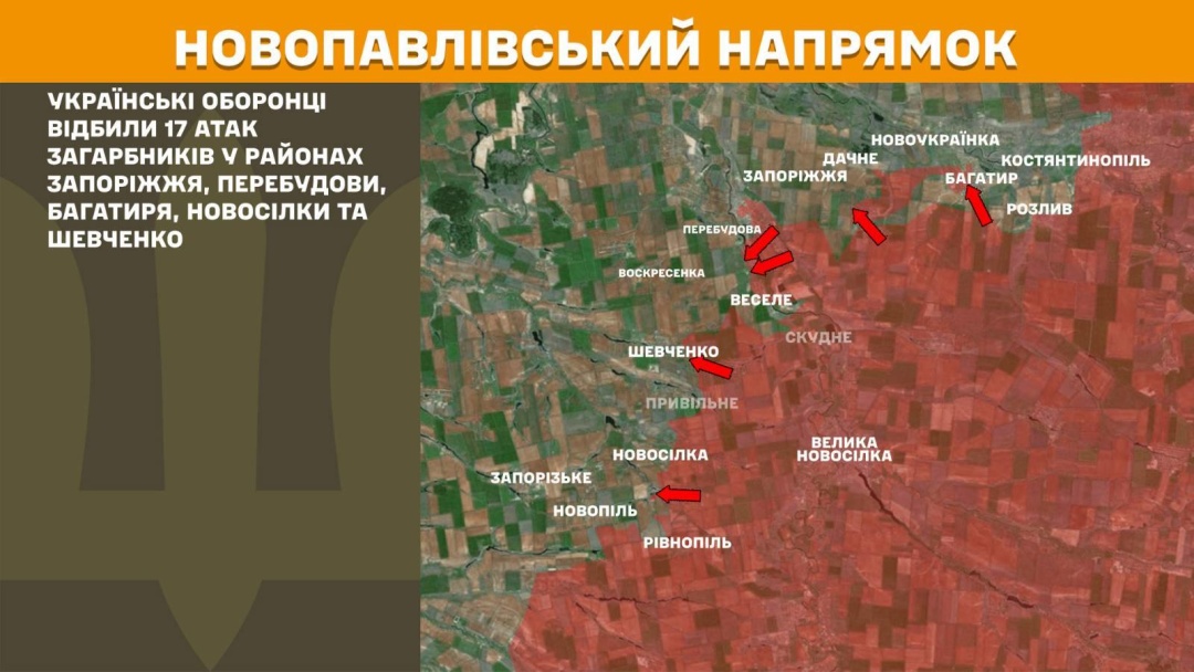 На Новопавлівському напрямку українські оборонці відбили 17 атак у районах Запоріжжя, Перебудови, Багатиря, Новосілки та Шевченка.