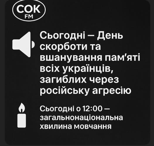 Сьогодні о 12:00 — загальнонаціональна хвилина мовчання. Приєднуйся до нас на хвилі «СокФм» за частотами 104.7 та 97.9 або за онлайн версіями.
