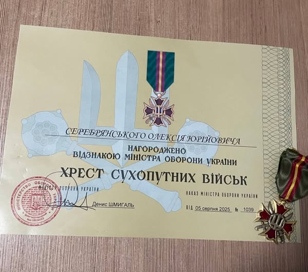 Наказом Міністра оборони України від 05 серпня 2025 року № 1039 Серебрянського Олексія Юрійовича нагороджено відзнакою Міністра оборони України «Хрест Сухопутних військ».