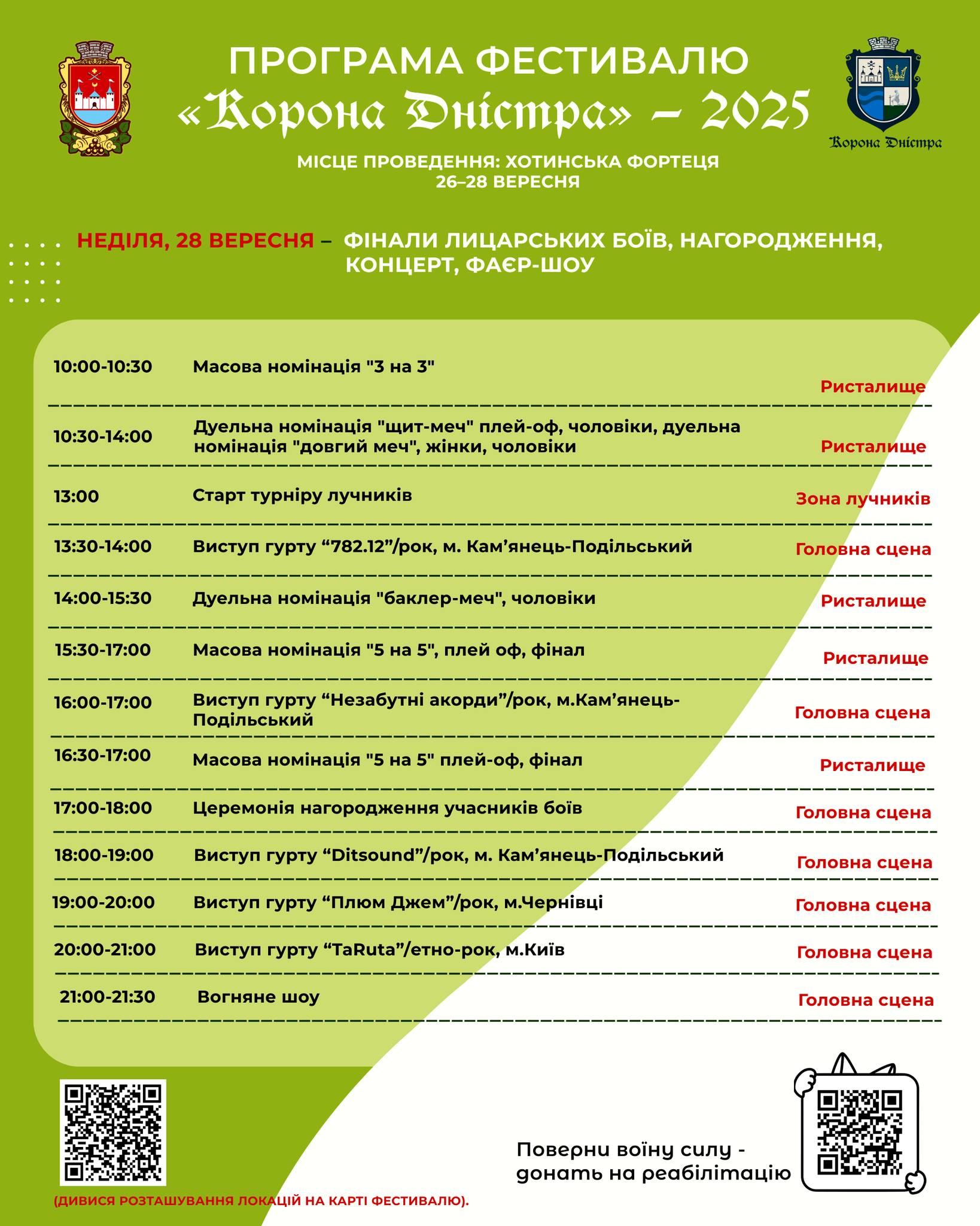 Детальну програму організатори публікуватимуть на офіційній сторінці події у соцмережах — «Фестиваль Корона Дністра».