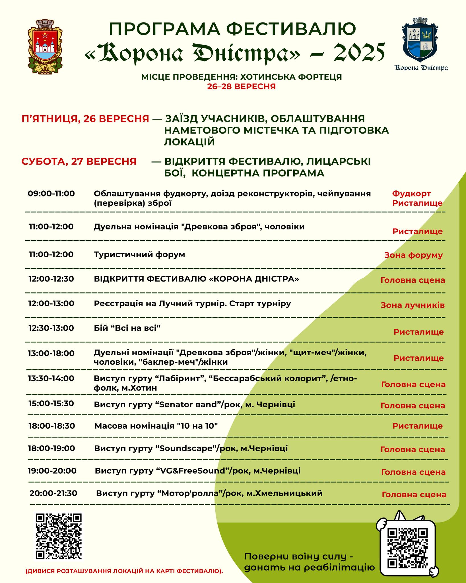 Уже цими вихідними, 27–28 вересня, Хотинська фортеця стане місцем проведення благодійного історичного фестивалю «Корона Дністра». Подія приурочена до Дня захисників і захисниць України та Дня міста Хотина.