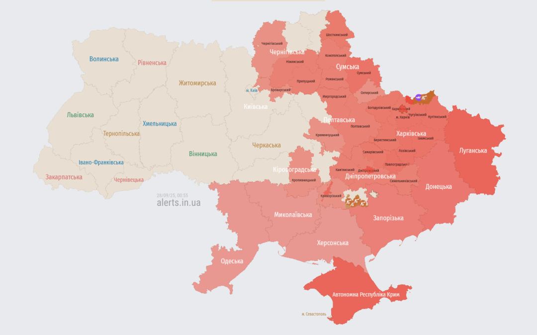 Актуальна мапа повітряних тривог станом на 00:55 / Джерело: https://alerts.in.ua/