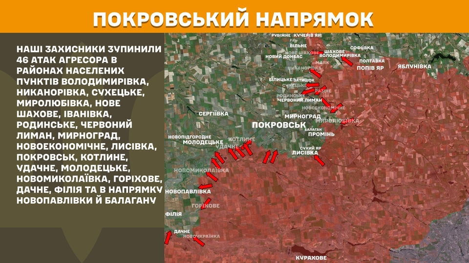 На Покровському напрямку захисники України зупинили 46 російських атак у районах населених пунктів Володимирівка, Никанорівка, Сухецьке, Миролюбівка, Нове Шахове, Іванівка, Родинське, Червоний Лиман, Мирноград, Новоекономічне, Лисівка, Покровськ, Котлине, Удачне, Молодецьке, Новомиколаївка, Горіхове, Дачне, Філія та в напрямку Новопавлівки і Балагана.