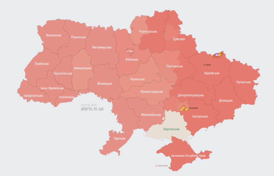 Актуальна мапа повітряних тривог України станом на 06:22 / Джерело: https://alerts.in.ua/