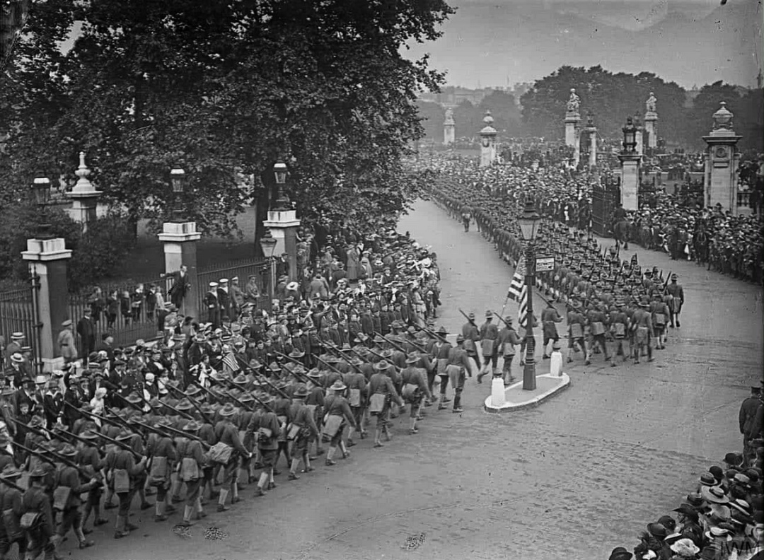 Колона американських військ проходить повз Букінгемський палац у Лондоні, 1917 рік. Фото wikipedia