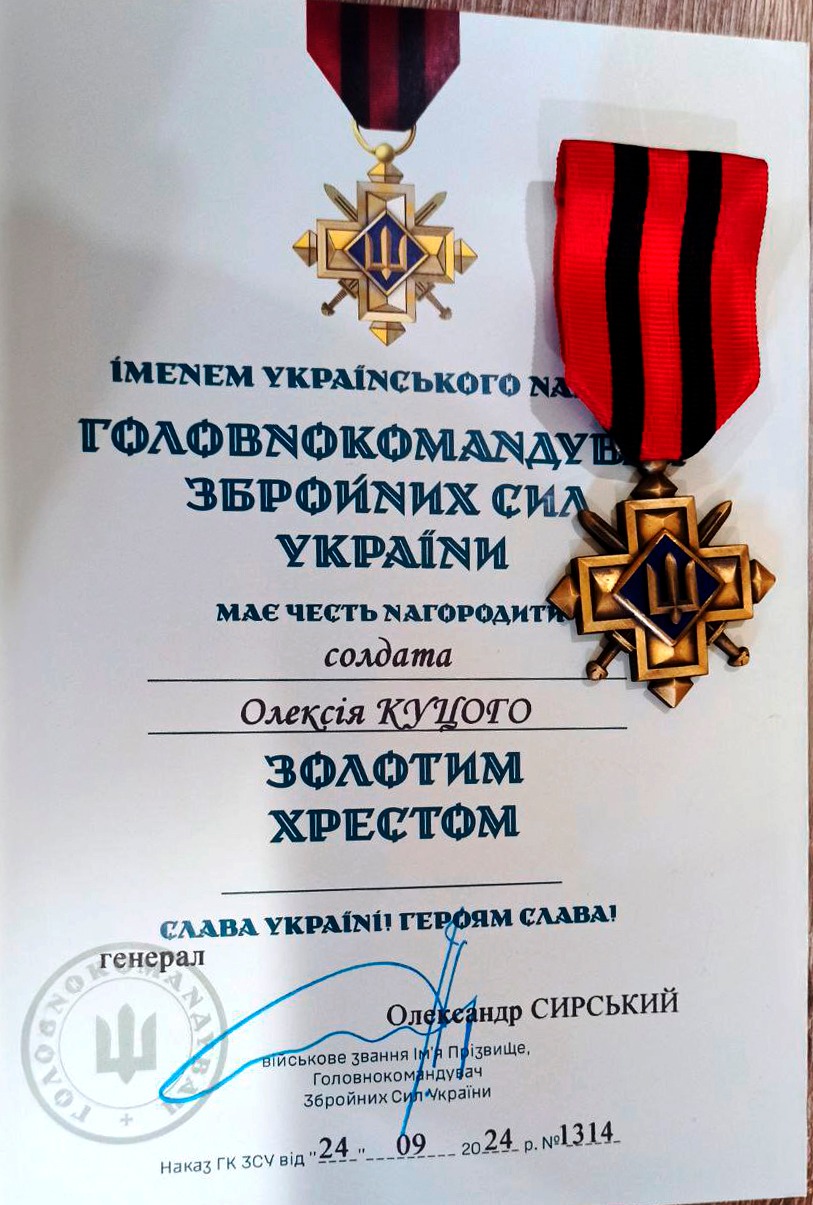 Воював чоловік гідно: за виняткову мужність і героїзм у бойових умовах 23 вересня 2024 року Головнокомандувач Збройних Сил України нагородив солдата Куцого Олексія Олександровича Золотим хрестом — однією з найвищих відзнак ЗСУ.