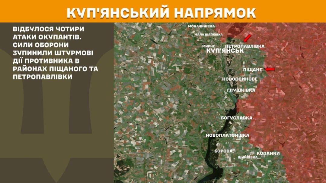 На Куп’янському напрямку сталося чотири ворожі атаки. Сили оборони зупинили штурмові дії військ РФ в районах Піщаного та Петропавлівки.