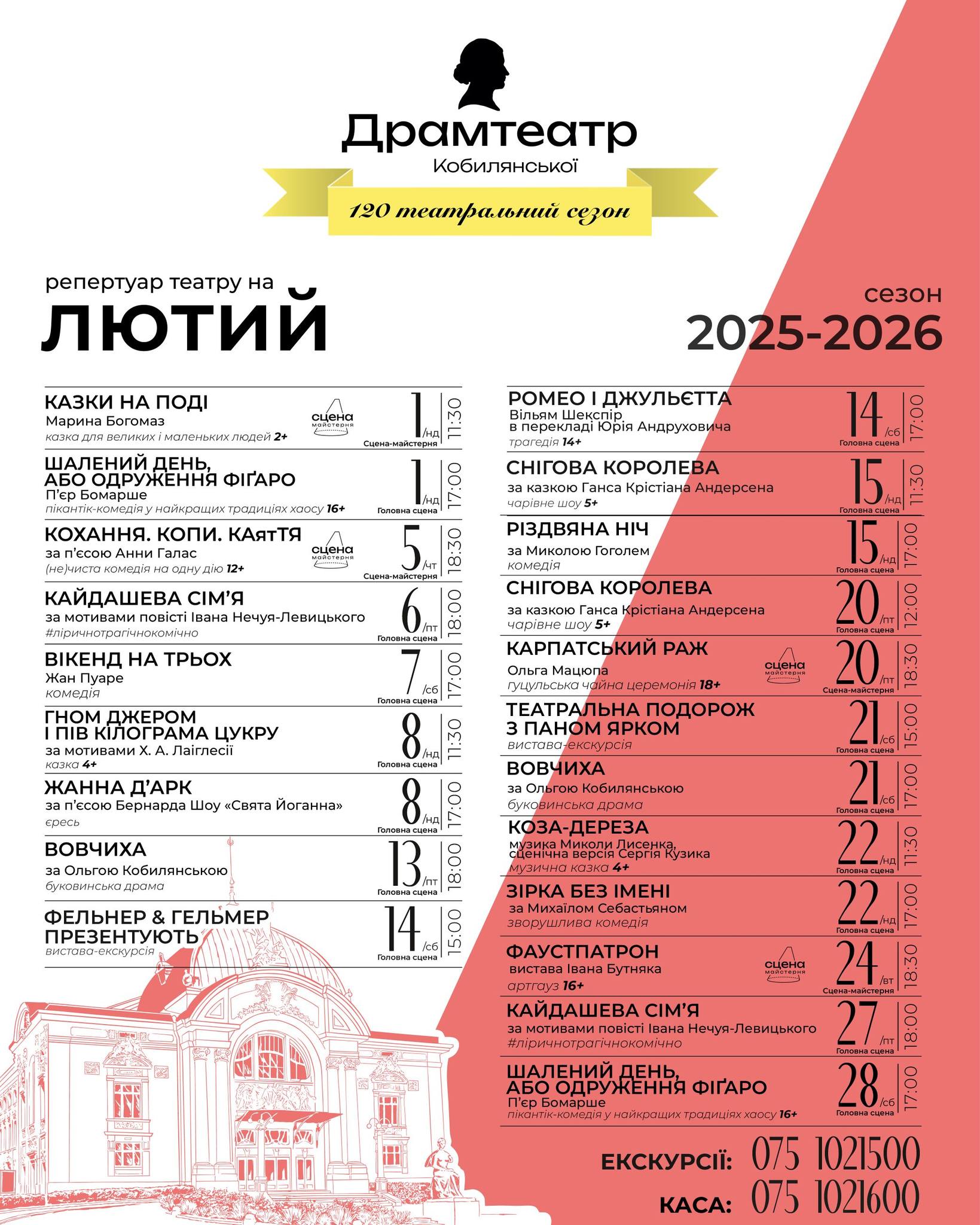 Чернівецький обласний академічний музично-драматичний театр імені Ольги Кобилянської опублікував афішу на лютий.