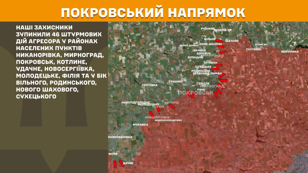 На Покровському напрямку українські бійці зупинили 46 штурмових дій агресора у районах Никанорівки, Мирнограда, Покровська, Котлиного, Удачного, Новосергіївки, Молодецького, Філії та у бік Вільного, Родинського, Нового Шахового, Сухецького.