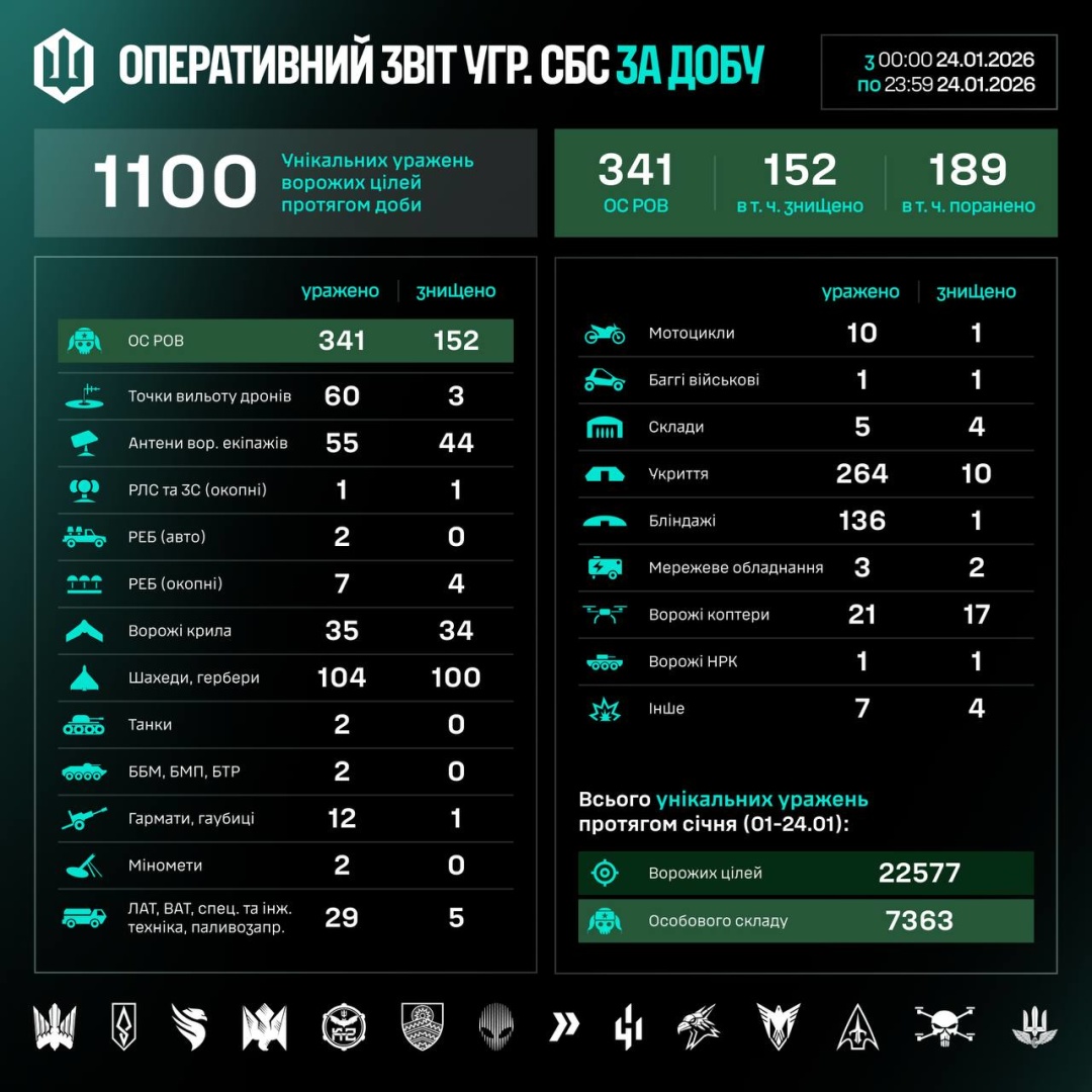Загалом з 1 по 24 січня підрозділи СБС знищили та уразили 22577 цілей, з них – 7363 особовий склад росіян.