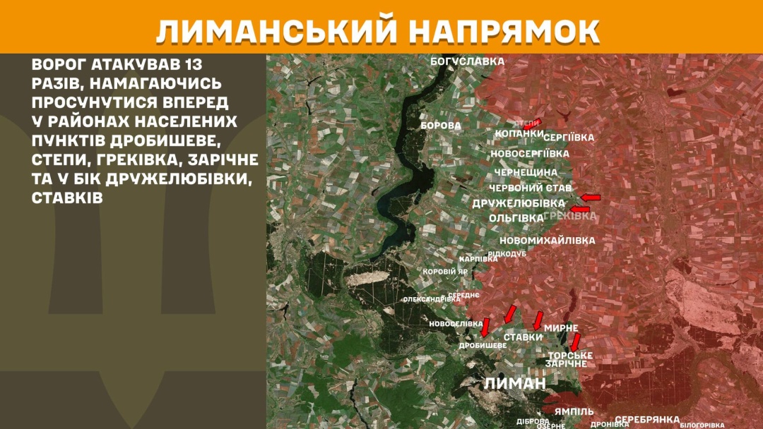 На Лиманському напрямку ворог атакував 13 разів, намагаючись просунутися вперед у районах Дробишевого, Степів, Греківки, Зарічного та у бік Дружелюбівки, Ставків.