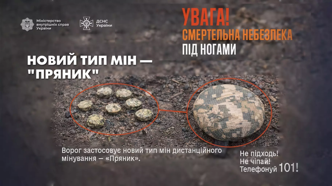 МВС попереджає про новий тип мін, якими росіяни мінують Україну Фото 06.04.2026 17:41 Укрінформ В Україні дедалі частіше фіксуються випадки дистанційного мінування територій саморобними вибухонебезпечними пристроями типу «ПРЯНИК».