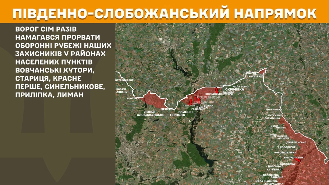 На Південно-Слобожанському напрямку ворог сім разів намагався прорвати оборонні рубежі в районах Вовчанських Хуторів, Стариці, Красного Першого, Синельникового, Приліпки і Лимана.